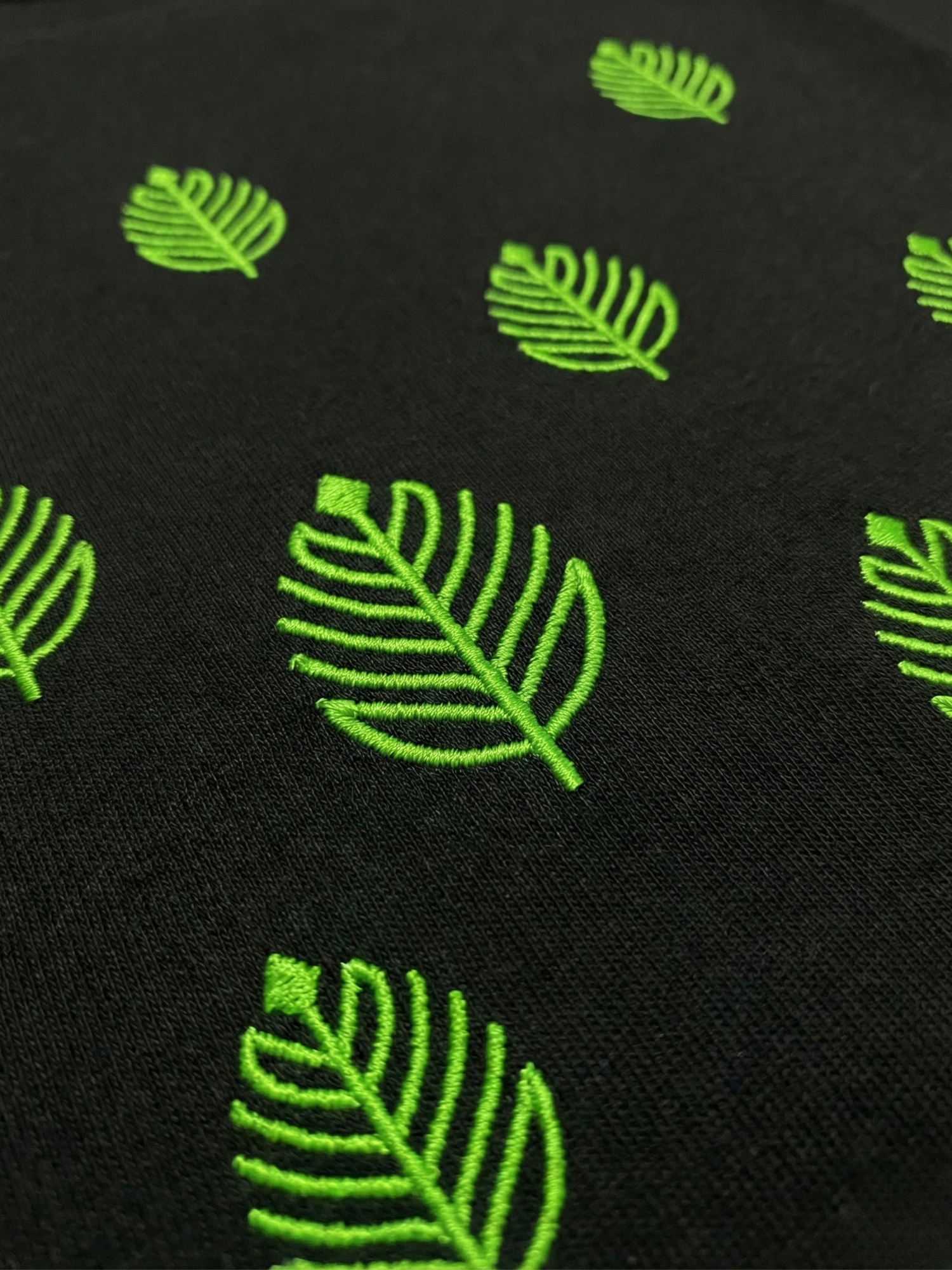 Scattered vine-leaf embroidery flows gently across the front, creating a natural rhythm that feels elegant without being overpowering. The clean placement and fine detailing allow the embroidery to stand out against the deep black base while maintaining a minimalist, wearable appeal.