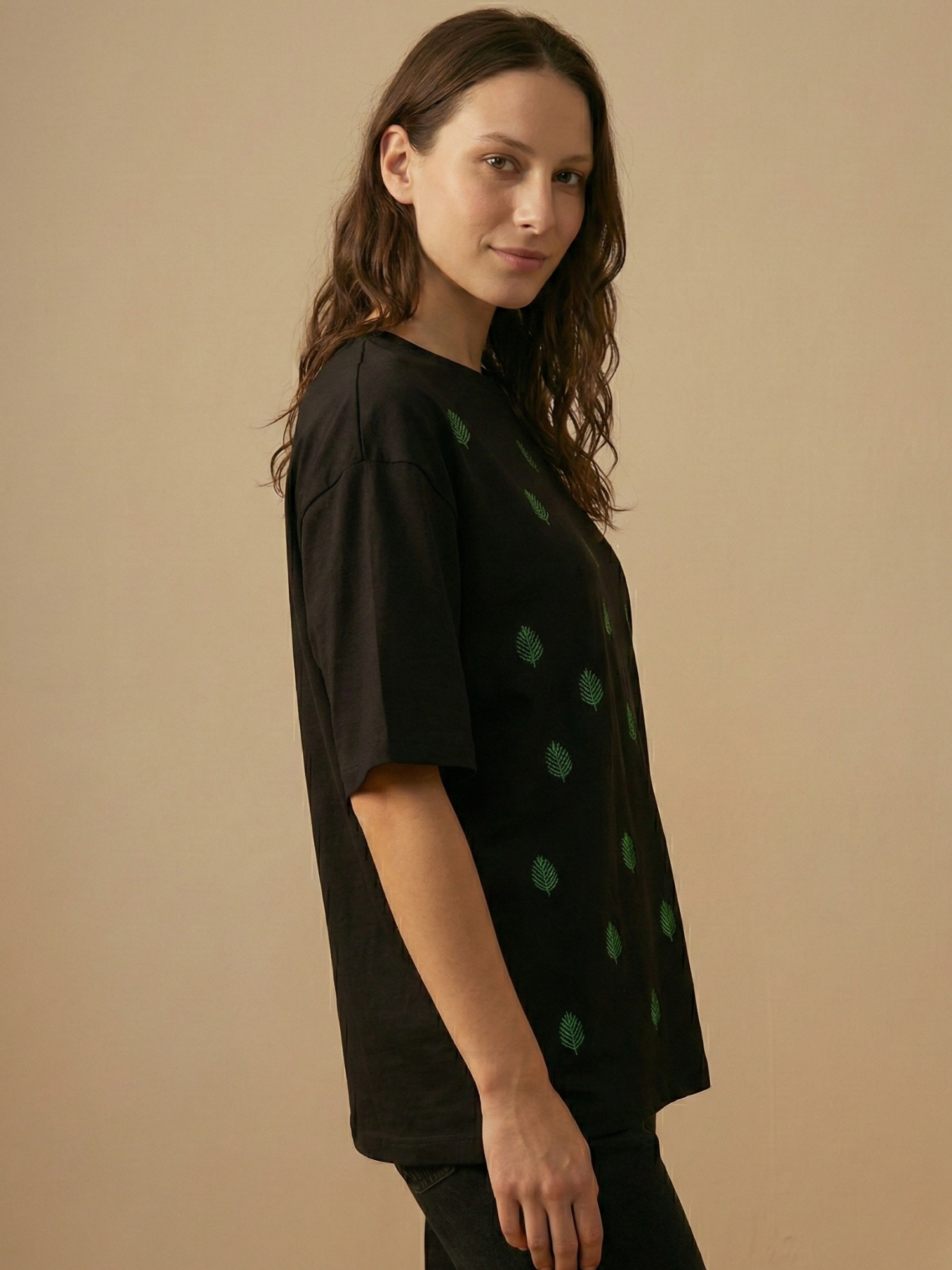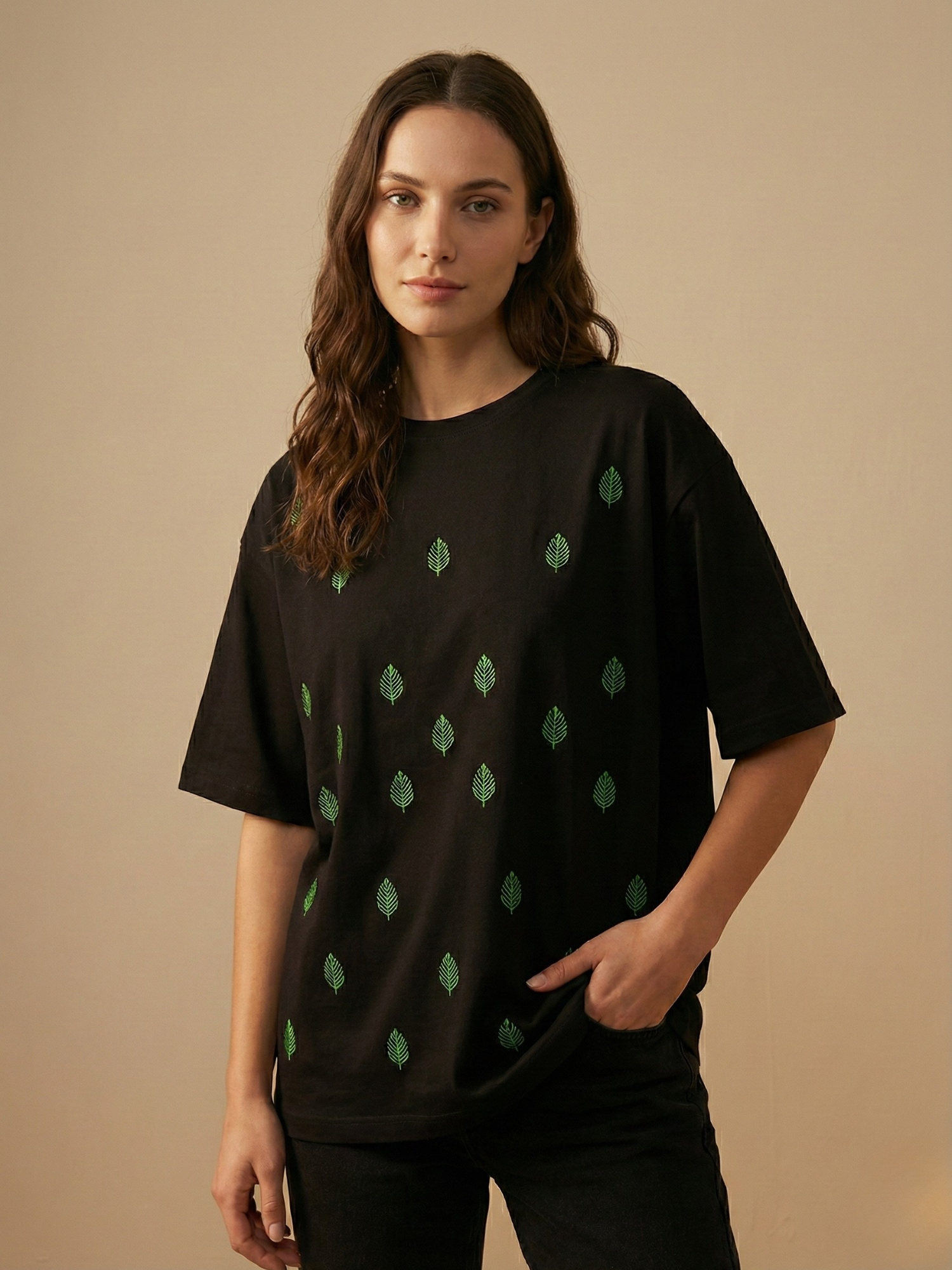 Subtle, balanced, and thoughtfully detailed – the Vine Leaf Bloom Embroidered Oversized T-Shirt by LabelResha celebrates quiet design and refined craftsmanship.